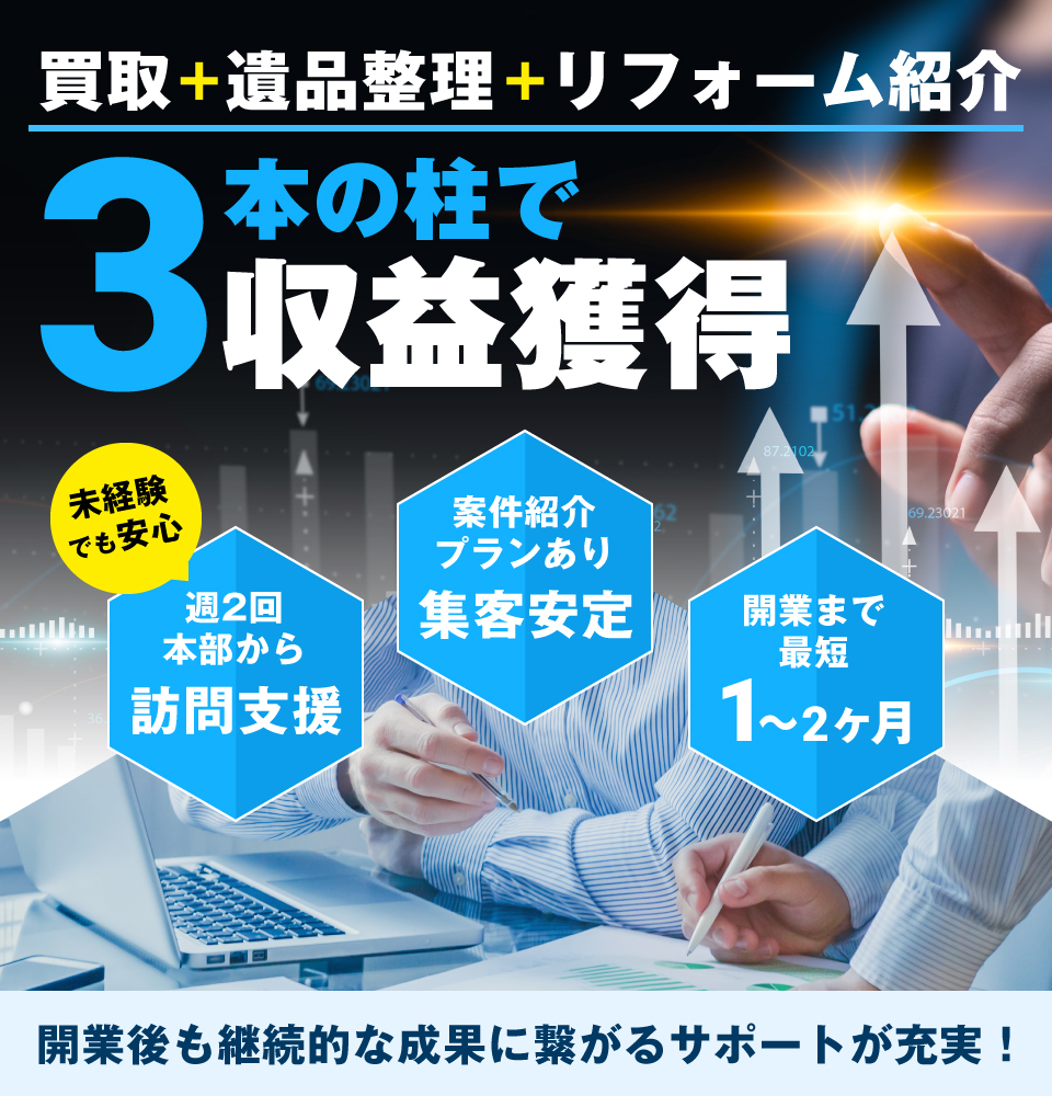 本部から買取以外にも、遺品整理やリフォームなどの案件を優先的に紹介。集客負担を減らしながら売上を拡大できます。